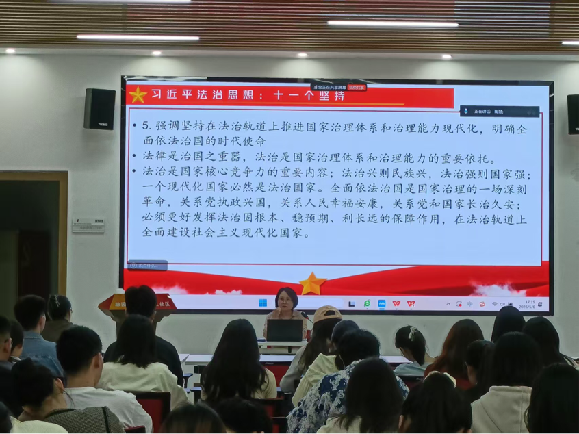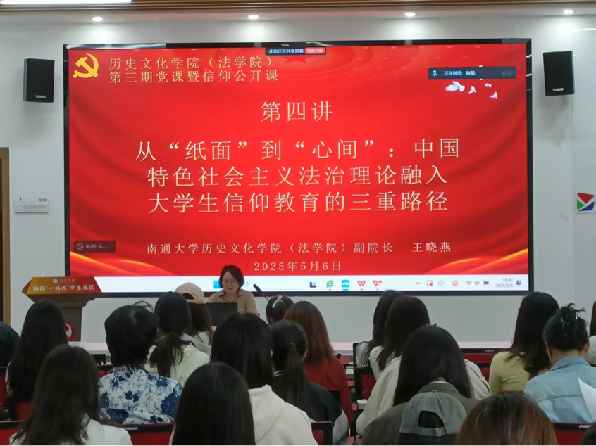 为深入学习贯彻中国特色社会主义法治理论,进一步挖掘其理论价值,引领青年学生思想进步、争做新时代优秀青年,5月6日下午,历史文化学院(法学院)在融园“一站式”学生社区举办以《从“纸面”到“心间”——中国特色社会主义法治理论融入大学生信仰教育的三重路径》为主题的专题党课暨信仰公开课。学院副院长王晓燕教授应邀主讲。