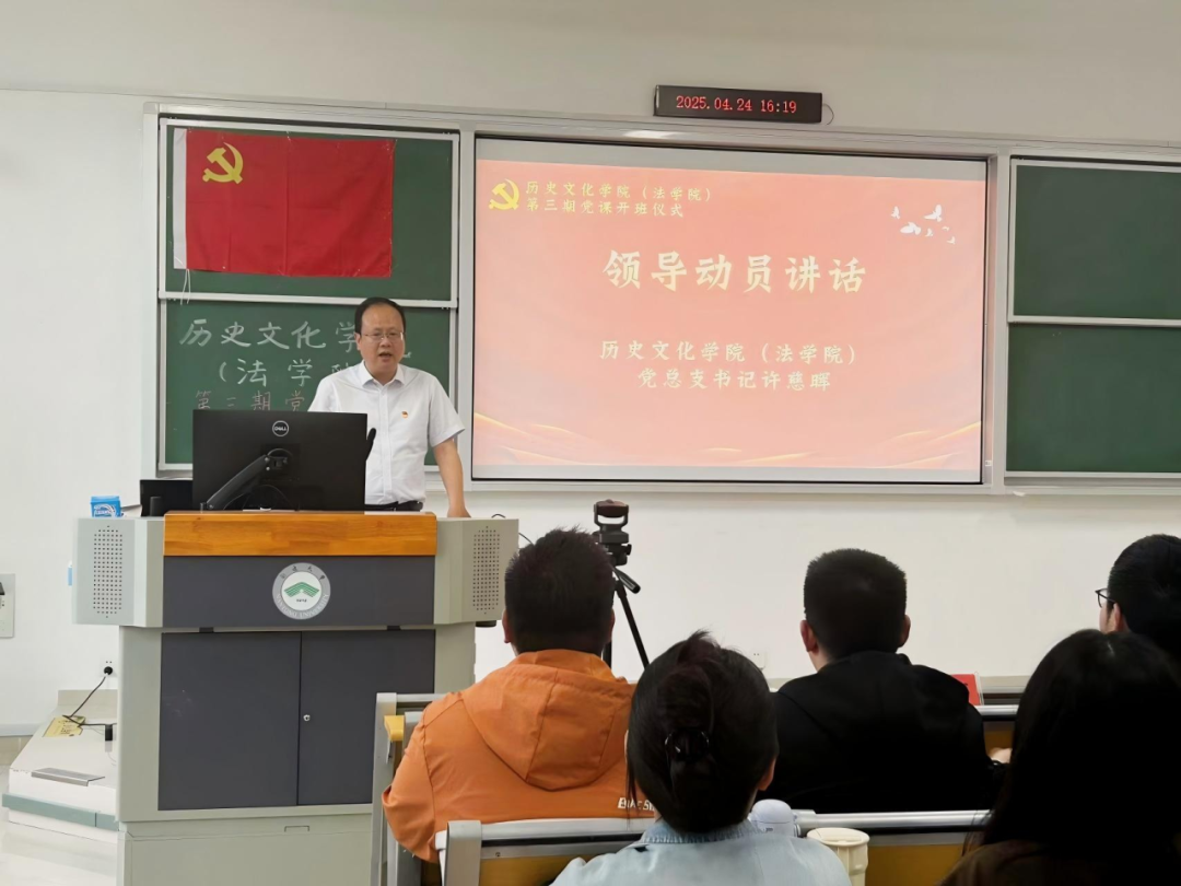 许慈晖祝贺培训班顺利开班并作开班致辞,对参训学员提出了四点期望和要求:一是坚定理想信念,筑牢信仰之基。强调理想信念对中国共产党人的重要性。二是锤炼品德修为,涵养高尚情操。作为未来的历史教育者和法律工作者,要积极践行社会主义核心价值观。三是努力学习知识,提升政治素质。他希望学员们珍惜平台和机会,既要学好党的基础理论知识,也要兼顾专业学习。四是勇于担当作为,践行初心使命。要培养责任意识和担当精神,发挥先锋模范作用,积极投身社会实践活动,用实际行动践行初心和使命。许慈晖殷切地希望学员们能珍惜这次党训班学习机会,端正态度,遵守纪律,认真学习交流,争取学有所获。