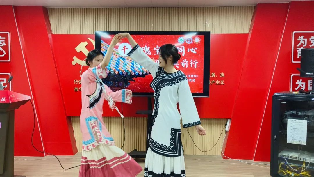 活动在彝族舞与古典舞的交融中拉开帷幕。董莹莹同学以翩跹衣袖勾勒山河画卷,孔晨轩同学用轻盈舞步演绎华夏春韵,一刚一柔间架起古今对话的桥梁。主持人深情阐释:“舞步踏响山河韵,同心共绘团结情!”这场跨越地域与民族的舞蹈盛宴,正是中华文化“各美其美,美人之美”的生动注脚,也是学院“思政+艺术”育人模式的创新实践。