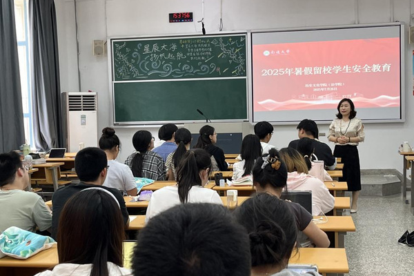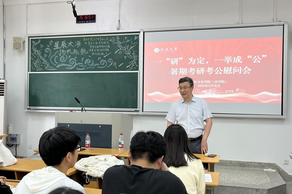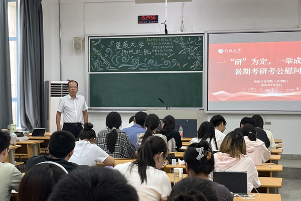7月26日下午,历史文化学院(法学院)在3号楼103自习教室举办了“一‘研’为定 一举成‘公’”暑期考研考公慰问会暨留校学生安全教育活动。学院院长钱荣贵、党总支书记许慈晖、党总支副书记兼副院长袁小平、学工办主任陶慧来到教室,与留校备考学子亲切座谈,送上学院的深切关怀与殷切嘱托。