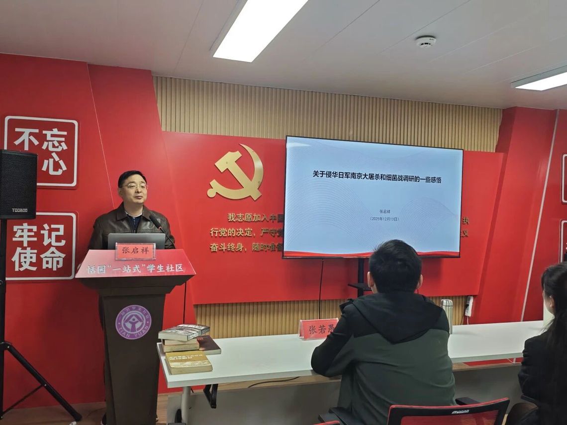 张启祥主任以《关于侵华日军南京大屠杀与细菌战调研的思考》为题,开展专题讲座。他结合自己从2000年开始对侵华日军细菌战受害者与南京大屠杀幸存者的口述史调研经历,向在场师生讲述了历史证据的力量、受害者的真实痛苦、青年使命的担当,并引用亲历者访谈史料和档案,发出“前事不忘,后事之师”的时代呼吁。
