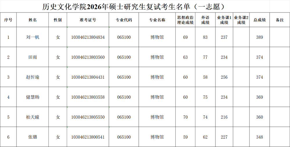 历史文化学院2026年硕士研究生复试考生名单(一志愿)